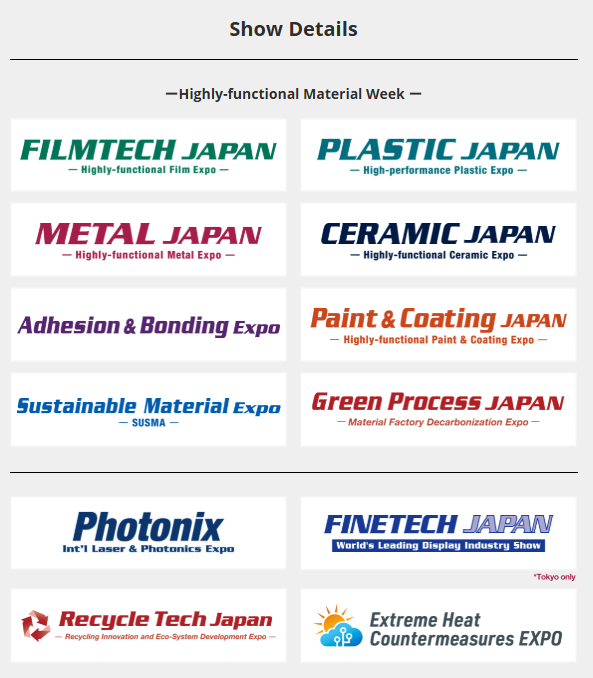 Material Week Tokyo 는 기업들이 경량화·내구성 향상·친환경·기능성 등 새로운 소재 요구가 급증함에 따라 이를 충족하기 위해 만들어졌으며, 금속·플라스틱·복합재·세라믹·유리·코팅·접착제·절연재 및 산업용 기능성 소재 등 폭넓은 카테고리를 다룹니다.