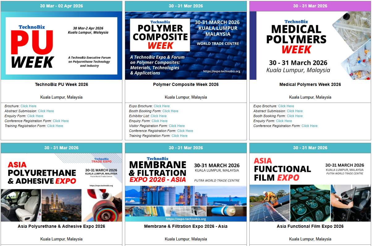 Polymer Composite Week 는 TechnoBiz가 처음으로 개최하는 폴리머 복합소재(Polymer Composites) 전문 국제 전시회 & 컨퍼런스입니다. 자동차, 건설, 항공우주, 신재생에너지 등 다양한 산업에서 각광받는 경량·고강도·설계 유연성을 가진 폴리머 복합소재를 중심으로, 아시아 시장을 겨냥한 최초의 전문 플랫폼이라는 점이 핵심입니다.