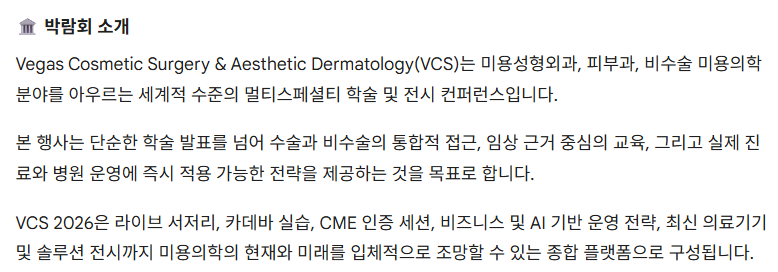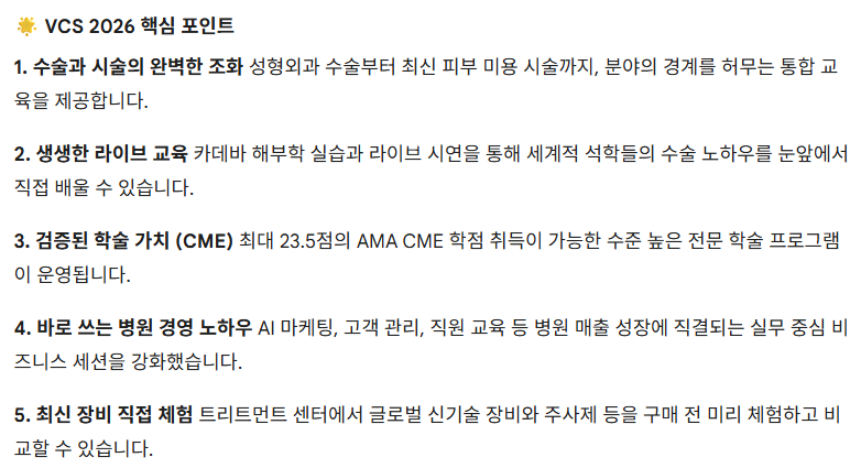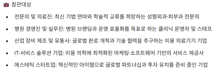 VCS 2026 전시 박람회는 미용의학 전반을 포괄하는 품목으로 구성됩니다.