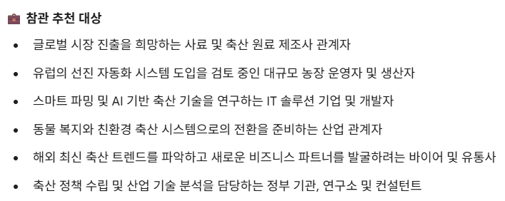 ▪️사육, 번식 및 농장 운영 (Farm Production) 가금·양돈·낙농·수산 사육 장비, 번식 및 부화 기술, 축사 설계 및 환경 제어 시스템, 분뇨 처리 및 순환농업 솔루션
