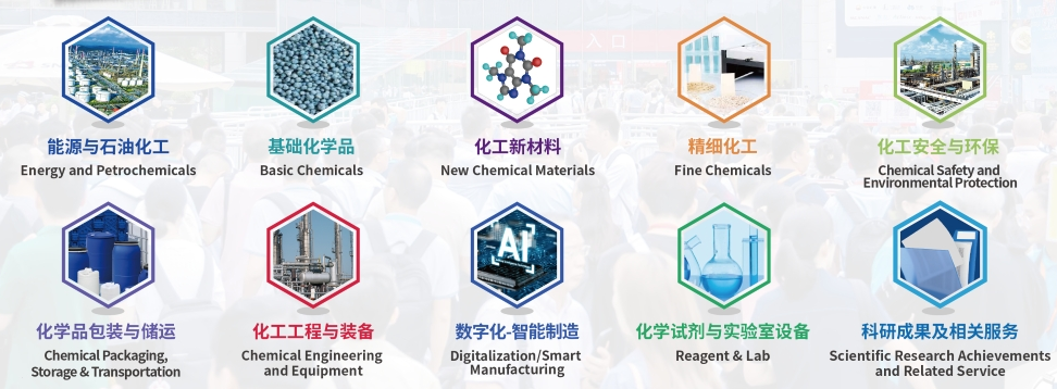 화학 산업의 상류부터 하류까지 10대 핵심 카테고리가 체계적으로 전시됩니다.