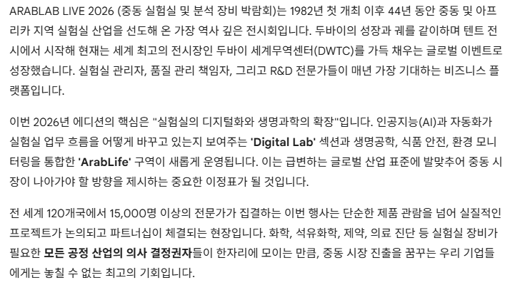 생명과학 및 환경 (ArabLife): 생명공학 연구 장비, 식품 안전 테스트, 환경 모니터링(수질, 대기, 토양 분석), 의료 진단 기기
