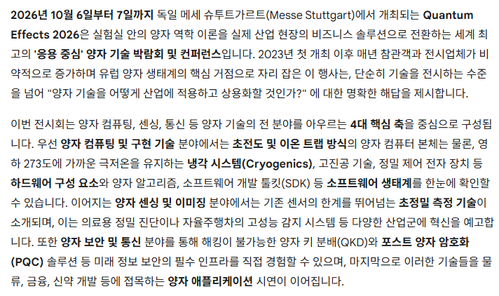 초저온 냉각 시스템(Cryogenics), 진공 기술, 레이저 및 광학 부품, 정밀 제어 전자 장치, 초전도 회로 등 양자 시스템 구현을 위한 핵심 부품