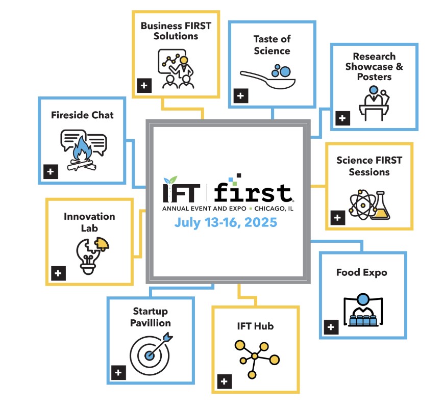 IFT FIRST는 연구 , 과학 , 기술(Food Improved by Research, Science, and Technology ) 로 개선된 식품 을 의미 하며 , 최고의 연례 식품 시스템 행사입니다. IFT FIRST는 획기적인 혁신이 실제 솔루션을 만나는 곳으로, 우리의 식품을 더 안전하고 지속 가능하며 기술적으로 진보시키는 데 참여하는 모든 사람을 하나로 모읍니다. 새로운 재료, 가공 기술, 식품 안전 또는 지속 가능성에 관심이 있든, 수천 명의 식품 과학자, 연구자 및 산업 전문가와 함께 많은 전시 회사의 최첨단 연구와 솔루션을 찾을 수 있습니다. 식품의 미래가 형성되는 곳입니다.