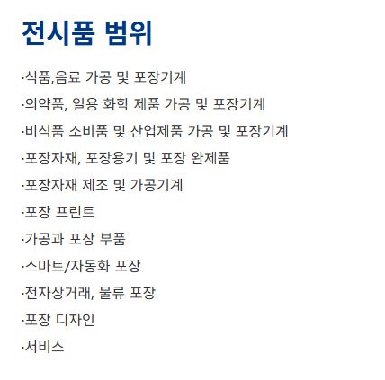 포장 전공정(기계, 재료, 인쇄, 물류, 스마트 기술)을 통합적으로 다루며, 특히 식품·화장품·의약품·산업재 포장 분야에 특화되어 있는 박람회입니다.