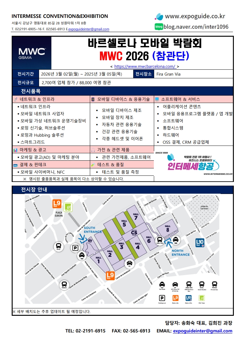 인터메세항공에서는 전시장과 도보 거리 호텔, 항공권, 현지 교통, 전시장 등록 대행까지 포함된 전시회 특화 출장 패키지를 제공합니다. 맞춤형 일정 구성 가능하며, 다년간의 MWC 시리즈 운영 노하우로 안정적이고 효율적인 출장 일정 설계를 도와드립니다.