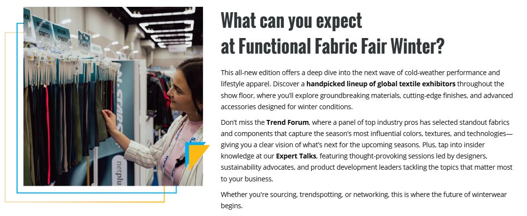 Functional Fabric Fair은 **“고성능 기능성 소재의 소싱 플랫폼”**으로서, 직물 · 원사 · 트림 · 액세서리 · 신발소재 등의