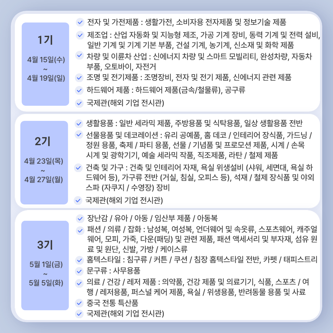CANTON FAIR 는 3회로 나뉘어 개최되며 각 기수마다 전시 품목이 다릅니다.