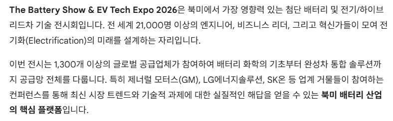 배터리 원재료부터 전기차 파워트레인까지 공급망 전반의 혁신 기술이 전시됩니다.