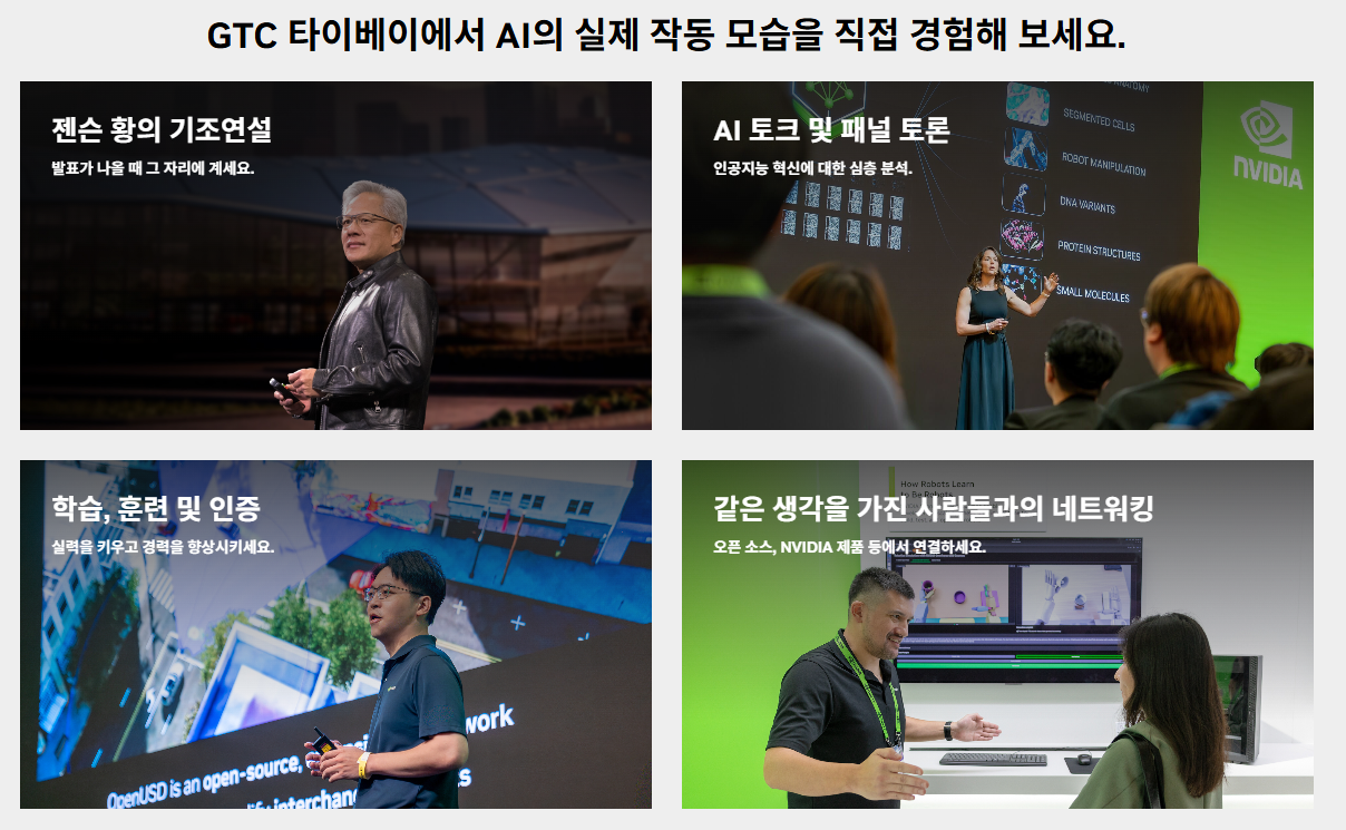 AI 팩토리 및 인프라 확장 전략을 통해 데이터 센터 운영의 효율성을 극대화할 수 있는 실질적인 인사이트를 얻을 수 있습니다. 엔비디아 CEO 젠슨 황의 키노트를 필두로 한 심층 세션은 귀사의 비즈니스를 AI 우선 순위 시대로 전환하는 결정적인 기회가 될 것입니다. 본 참관을 통해 차세대 AI 혁신을 주도하는 글로벌 리더들과 네트워킹하고 미래 경쟁력을 선점하시기 바랍니다.