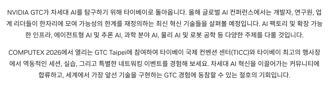 NVIDIA GTC 2026 타이베이는 전 세계 AI 생태계를 주도하는 엔비디아의 기술력이 집약된 글로벌 컨퍼런스로, 단순한 기술 발표를 넘어 차세대 산업 혁명의 이정표를 제시합니다. 특히 세계 최대 ICT 전시회인